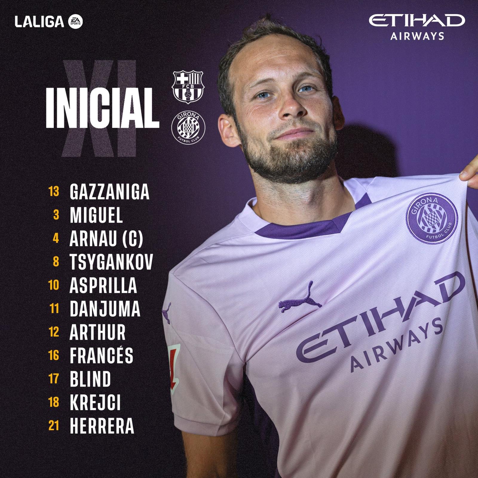 赫罗纳首发:13-加扎尼加、3-米格尔-古铁雷斯、4-阿尔瑙-马丁内斯、16-亚历杭德罗-弗朗西斯、17-布林德、18-克雷吉奇、21-扬格尔-埃雷拉、12-阿图尔、8-齐甘科夫、10-阿斯普里拉、11-丹朱马